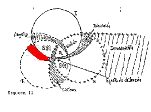 Adriana Bauab Dreizzen "quien expresa, una coincidencia entre las neurosis actuales y el fenómeno psicosomático es este modo de respuesta inmediata, actual, sin intervención de la angustia como señal, casi a nivel de la reacción refleja del experimento de Pavlov, por lo antedicho, y como el fenómeno psicosomático afecta el cuerpo real pero "en su fundamento esta profundamente arraigado en lo imaginario" proponemos, en el nudo borromeo, que esta al comienzo del seminario R,S,I situarlo en oposición a la angustia, es decir en un sombreado en el que partiendo de lo imaginario recubre el anillo de lo real" (11)