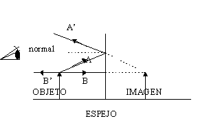 Uno toma un punto de la imagen, yo tomé como ejemplo una pequeña flecha, y estoy viendo dónde se va a formar la imagen de la punta de la flecha, del mismo modo tendría que hacer la construcción para cada uno de los puntos que pertenecen a dicha flecha. La ley de reflexión antes enunciada va a cumplirse para los espejos planos, los esféricos y para cualquier superficie reflectora. Los rayos que inciden en un espejo, de acuerdo con la ley de Snell se reflejan con el mismo ángulo respecto a la normal al espejo, en el punto de incidencia. Si el ángulo que forma con la perpendicular es 0, como en el caso del rayo B, se reflejará formando un ángulo 0 y vuelve sobre sí mismo. El rayo A de igual modo se refleja respecto de la normal formando el mismo ángulo de incidencia. Uds. se dan cuenta que lo que recibe alguien que está parado del mismo lado del espejo que el objeto, viendo la imagen, son los rayos que le llegan; los rayos incidentes viajan hacia la derecha, no llegan a la persona que está indicada por el ojo, los que lleguen serán B y A, pero esos son rayos divergentes, no se juntan en ningún punto. La imagen se produce en la retina de tal manera que la misma se forma en el lugar donde parecieran converger estos dos rayos, si prolongamos A y B hacia la derecha convergen en la punta de la flecha imagen. Entonces la imagen en un espejo plano se forma del otro lado del espejo, la que Uds. ven todas las mañanas, y es una imagen virtual. Es virtual porque los rayos no se cruzan efectivamente en esa imagen, sino que es como si hubieran provenido de ese punto. Una imagen virtual pues, se produce del otro lado del espejo y no en el lugar desde donde provienen los rayos, sino desde donde parecieran provenir.