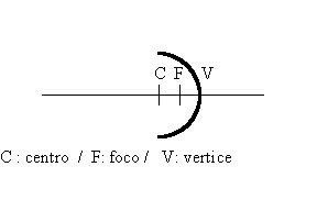 Tiene algunos elementos que son importantes. El centro, que es como si fuera el centro de la esfera si yo la completara, el foco que es un punto particular y el vértice. La línea CV es el eje del espejo. R, que es la distancia desde el centro a la superficie de la esfera, es el radio. Y el foco (se puede hacer el cálculo) está situado en un espejo esférico justo en la mitad (Figura 3).