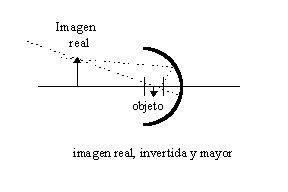 Me voy a detener a decir lo que es una imagen real. Hasta aquí quedó claro que una imagen virtual es la imagen formada del otro lado del espejo y de donde no provenían los rayos sino que parecían provenir. En una imagen real los rayos efectivamente se cruzan en el punto en que se produce la imagen y para alguien que esté viendo del lado del objeto, se forman del mismo lado donde está el observador, y efectivamente los rayos que le llegan (que son los que "rebotan"), se cruzan donde aparece la imagen. Esto da la ilusión de una imagen totalmente distinta a la que uno ve en un espejo plano, se llama imagen real, está del mismo lado que el objeto y de ahí efectivamente provienen los rayos que se cruzaron.