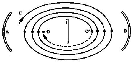 ¿Cómo pensar la dirección de la cura desde esta perspectiva?, o sea ¿qué hace Lacan?, pone un analista, o sea reduplica lo que hay de un lado al otro, pone otro sujeto. Tenemos entonces el espejo esférico A y el punto O, el espejo esférico B, el punto O' y la posición del sujeto, se acuerdan que el sujeto estaba en C. (14)
