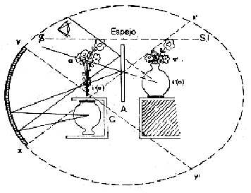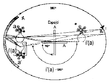 Para el ser humano hay una doble perdida, porque tampoco tendrá acceso a la gestalt formada por la imagen de la imagen real y la imagen del objeto real, sino es por el agregado de este espejo plano (Figura 8) (13), porque la posición del sujeto está donde se dibuja el ojo.