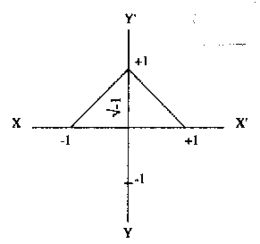 Por un lado intenta representarlo como la "media geométrica" de un triangulo que luego transportará sobre el plano cartesiano (entre -1 y+1 para el eje X y +1 sobre el eje Y).