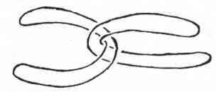alors quici à prendre, à prendre mon cercle unique, vous auriez le support de ce cercle et quatre brins à passer, ce qui ferait un affrontement non pas de deux à deux qui font quatre mais de quatre à un qui font cinq. Et donc on pourrait dire que même ce qui serait alors, puisque ici vous navez que deux éléments, le troisième élément, le troisième élément dans son rapport topologique naurait pas le même rapport avec les deux autres que les deux autres entre eux. Et comme tels, à simple inspection des nuds en fonction, le troisième élément se distinguerait des autres.