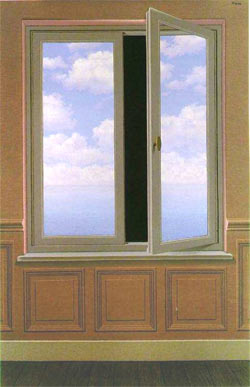 René MAGRITTE: La condición humana, La llave de los campos, El catalejo. "Los que escucharon mi intervención en las Jornadas Provinciales concernientes al fantasma, {...} pueden recordar de qué me serví como metáfora: de un cuadro que viene a ubicarse en el marco de una ventana. Técnica absurda, sin duda, si se trata de ver mejor lo que hay sobre el cuadro, pero, como también lo expliqué, no es de eso, justamente, que se trata, es de, cualquiera que sea el encanto de lo que está pintado sobre la tela, no ver lo que se ve por la ventana."