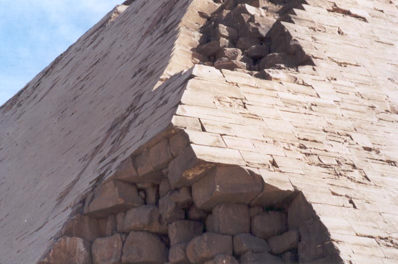 Inclinaison marquée des lits de pierres constituant le revêtement de la pyramide rhomboïdale
