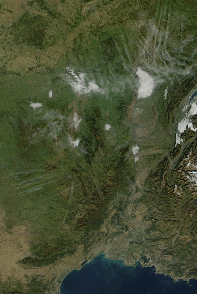 19 août 2006 : Une photo de la France prise par satellite, transmise par M. Bertou Espigoule, qui semble montrer des dérives de traînées de condensation, dues au vent.