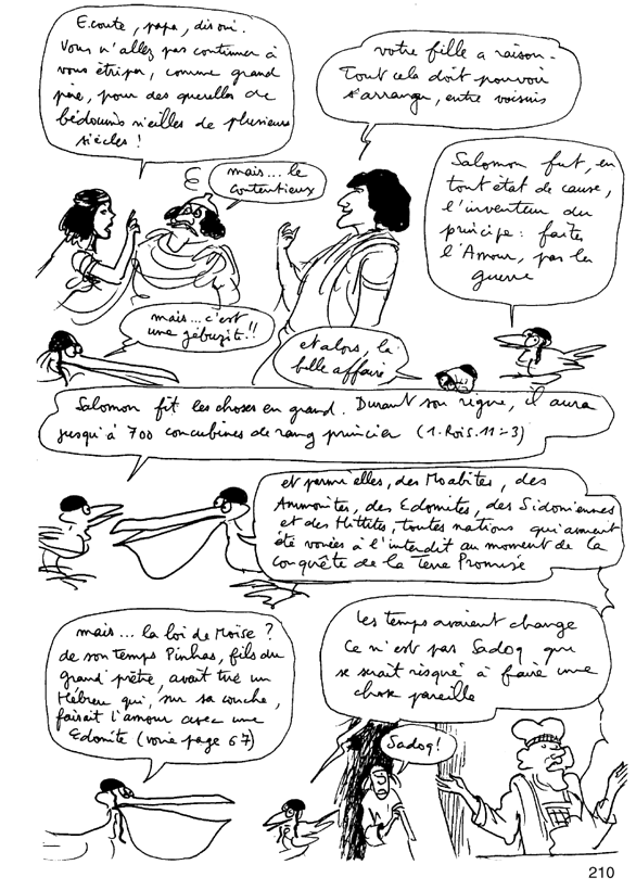 L'histoire de la Palestine s'identifie avec celle du peuple juif, quand on se projette des millénaires en arrière. Cette histoire s'appelle l'Ancien Testament. Beaucoup de choses sont susceptibles de s'éclaircir si on connait ce document, un peu volumineux. Deux mille cinq cent pages, sauf erreur, en version poche, bon marché, en deux tomes. Il existe une version judéo-chrétienne et une version abrégée, représentée par des fragments du Coran. Il y a quelques différences entre les deux. Nous laisserons aux lecteurs des deux documents le soin de les découvrir. Il y a plus de dix ans j'avais entrepris un travail personnel sur la Bible, Ancien et Nouveau testament compris. Le point de départ avait été une émission de télévision à laquelle j'avais assistée et où des religieux s'étaient vigoureusement affrontés, précisément à propos de la Palestine. Je n'avais pas très bien capté leurs arguments respectifs, mais une chose m'était restée. Ces hommes s'étaient quittés, chacun s'écriant "tout est dans Le Livre ! ". De quel livre, ou de quels livres ces gens parlaient-ils ? J'ai tenu à me renseigner. J'ai essayé de rendre cette Bible lisible, en utilisant la technique de la bande dessinée, à travers la façon dont j'avais perçu ces textes, bien sûr. Mais, très vite, je me suis aperçu qu'une bonne chose consistait à reproduire in extenso des extraits de textes, le plus souvent dans les "bulles", avec les références. Cette bande-dessinée-fleuve peut être lue en tenant dans l'autre main le document de base, le véritable texte biblique ou du moins une de ses traductions (mais elles diffèrent en fait assez peu les unes des autres). Je me rappelle qu'à l'époque j'avais eu des heurts avec des juifs pratiquants et cela avait été pour moi l'occasion de m'apercevoir qu'ils connaissaient fort mal leurs "textes de base". Même choses pour des catholiques ou des protestants. Après avoir été accueilli à bras ouverts par les moines du couvent Saint Jean de Malte d'Aix, tant qu'il s'était agi de l'Ancien Testament, je me suis fait accueillir plutôt fraîchement dès que j'ai exhumé certains passages des Actes et Epîtres (totalement inconnus de la plupart des chrétiens). J'ai entendu par la suite un pasteur lire à la télévision un psaume. A mon grand étonnement, il sautait des versets. Quand je l'ai eu au téléphone il m'a dit avec beaucoup de naturel "mais on n'est pas obligé de tout lire !". La religion est donc un système "à la carte" et les choses se compliquent quand le texte lui-même peut être interprété, ce qui apparaît clairement quand on décline les différentes traductions françaises disponibles, qui peuvent aller jusqu'à se contredire totalement.