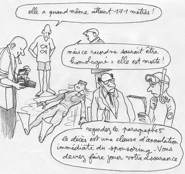 Derrière tout cela il y a une responsabilité fantastique des médias. Je ne sais pas si les gens réalisent à quel point nos médias sont en train de modeler nos vies et ce qui se passe dans les têtes de nos gosses. Cette nouvelle de la mort d'Audrey Mestre va tomber sur les téléscripteurs des agences de presse, dans les rédactions des chaînes de télé. Peut-être en parlera-t-on ? Mais comment ? On annoncera la nouvelle, tout simplement, en montrant "les récentes images de la plongeuse aux essais". Peut être interrogera-t-on le champion français de la "discipline", voire le "Président de la fédération Française d'Apnée" ? Un ou une journaliste imbécile demandera peut-être gravement "à votre avis, pourrait-il s'agir d'un accident de décompression ?" et le "reponsable" répondra : "non, le temps de station en profondeur est trop bref pour qu'il pûisse s'agir de cela. Nous menons actuellement une enquête pour déterminer les causes exactes de l'accident". Et les gens hocheront gravement la tête, le journaliste concluant "enquête en cours". Mais personne ne songera à inviter sur un plateau un type comme moi, qui puisse un bonne fois dénoncer ce mensonge dramatique. En trois phrases et deux dessins j'aurais vite faite de remettre quelques pendules à l'heure.