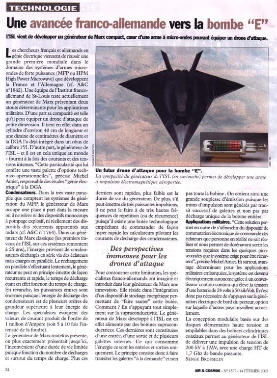 14 février 2003 : parution de ce papier dans Air et Cosmos. On peut considérer ce lâcher d'information comme une sorte de réponse de la DGA à mes allégations selon lesquelles la France accuserait un retard de 25 ans sur les Américains. On sort donc le gadget top secret franco-allemand, le mini canon électromagnétique pour drone de combat. Au passage il se confirme que les français sont bien avancés vers la voie de bombes E de grandes puissance, à charge non seulement chimique mais aussi évidemment nucléaire. D'où la poursuite des essais nucléaires français sur le territoire national. A noter deux choses :