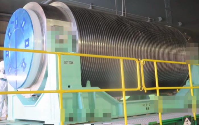 Avant extraction, chaque élément est examiné. Puis un crochet de levage exerce une traction limitée à une tonne. Les Japonais ont tenté d'évaluer la résistance à la corrosion en soumettant des éléments semblables, mais neufs, à l'action de l'eau salée ( photo ci-dessus. Ils ont été extraits en 2012 des 220 éléments présents dans la piscine, "prêts à l'emploi", donc non radioactifs. Extraits de leurs logements, un à un, les éléments sont alors replacés dans le baril. Quand celui-ci est chargé, le portique supérieur le prend en charge. Ce baril ayant été muni d'un couvercle étanche, est soulevé, puis transporté en dehors du bâtiment réacteur, juste au dessus d'un puits de section rectangulaire, où s'opère sa descente. En bas, il est réceptionné sur un véhicule spécialement conçu à cet effet. On le couche sur sa plate forme et il est ensuite dirigé vers un nouveau site de stockage, où on procédera à l'opération inverse.