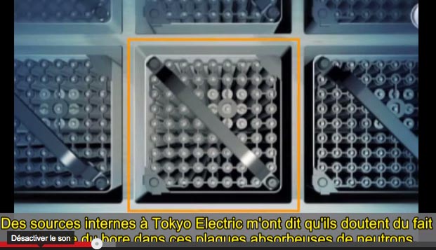 Dans les réacteurs à eau pressurisée, elles se situent sur le dessus et peuvent ainsi descendre par gravité. Mais, même si les réacteurs son "arrêtés", les produits de fission qu'ils contiennent reste actifs. En se décomposant, ils produisent de la chaleur. Il faut donc refroidir un réacteur " arrêté ", impérativement. L'arrivée du ras de marée ( vague de 14 mètres ) met hors service les groupes de pompage de secours en noyant les groupes électrogènes et les cuves à mazout destinées à les alimenter, qui sont en sous-sol. La température des coeurs monte alors rapidement. Ceux-ci fondent et, sauf avis contradictoire argumenté, ils percent le fond des cuves, s'écoulent sur l'assise en béton, de 8 mètres d'épaisseur. Il y a tout lieu de penser que ce béton est lui-même percé rapidement par ce qu'on appelle le "corium", un mélange d'éléments combustibles, d'uranium 238, d'uranium 235 et de plutonium 239, quand le chargement est partiellement composé de MOX ( mixed oxydes, chargement où le combustible est du plutonium. Du MOX fabriqué et exporté par les Français ). Voir le dossier sur le corium en fin de page. A Tchernobyl le coeur du réacteur a fondu. Mais la masse du corium, en s'étalant, n'a pas créé un intense dégagement de chaleur par criticité. Cette masse de corium est donc restée en l'état, posée sur une assise en béton, qu'elle n'a pas transpercé.