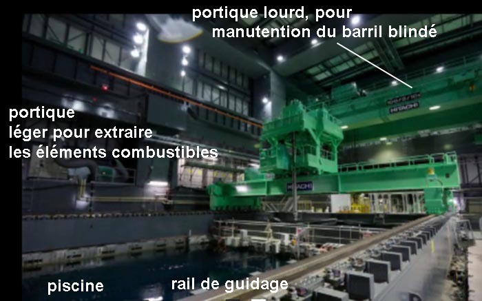 Ces rejets de gaz peuvent provenir de la rupture d'éléments combustibles au moment des manipulations. La salle ainsi aménagée comporte un dispositif de ventilation avec filtres, pour recréer dans cette enceinte une atmosphère normale, en évitant le rejet de substances radioactives vers l'extérieur du bâtiment Cette structure se poursuit par une portion qui surplombe ce qui reste du bâtiment réacteur. Elle est en porte à faux, mais les gens de TEPCO disent qu'elle a été dimensionnée de manière à pouvoir encaisser un séisme. Le bâtiment réacteur a été renforcé, autant que faire se peut. Mais il a été si affaibli par le séisme qui aurait été exclu d'appuyer un pont roulant lourd sur ce qui reste de ses structures. Le pont roulant léger (tout est relatif) qui équipait ce réacteur a été détruit et ses restes ont dû être extraits et évacués. Les Japonais ont donc installé deux ponts roulants. Le plus puissant court sur des rails qui sont "suspendus" au dessus des restes du bâtiment 4. Les débris de petite taille ont été extraits avec différentes pinces et placés dans des paniers grillagés. Ce travail a pris deux ans et demi. L'ensemble de ces opérations est visible sur cette vidéo :