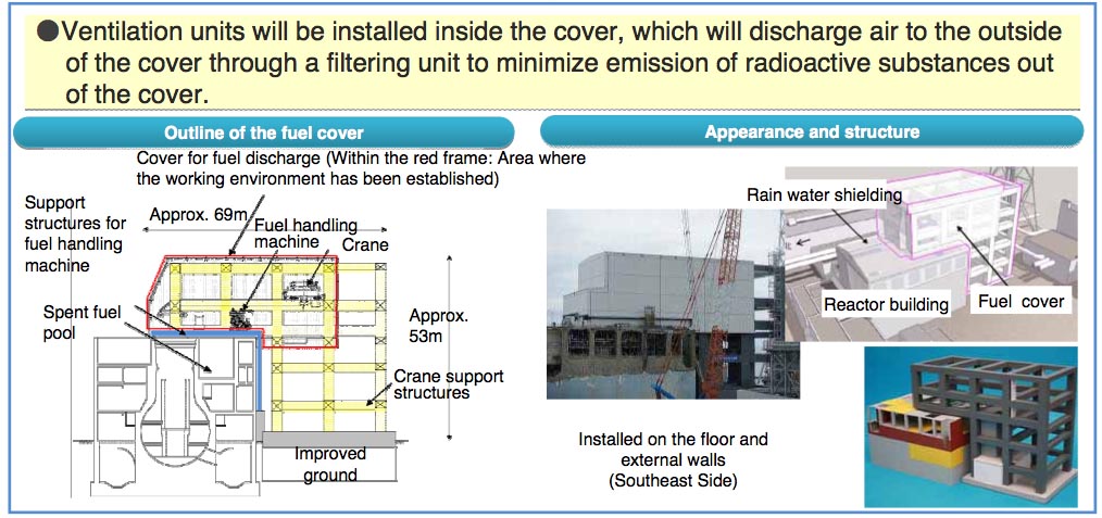 Quand on examine la solution mise en oeuvre par TEPCO, on est tenté de se dire qu'elle est optimale, par rapport à la tâche envisagée. La priorité (comme c'est le cas pour toutes les manipulations d'éléments combustibles, dans tous les réacteurs à eau du monde) est que toutes les manipulations soient opérées sous l'eau, et que jamais l'élément ne soit exposé à l'air libre. Si c'était le cas, l'élément, non refroidi, chaufferait très rapidement. Il serait alors endommagé et les résidus radioactifs à l'état gazeux se répandraient dans l'atmosphère Pour prévenir tout épanchement gazeux, TEPCO a entièrement couvert toute la partie du bâtiment où s'effectuent les opération de manipulation des éléments.