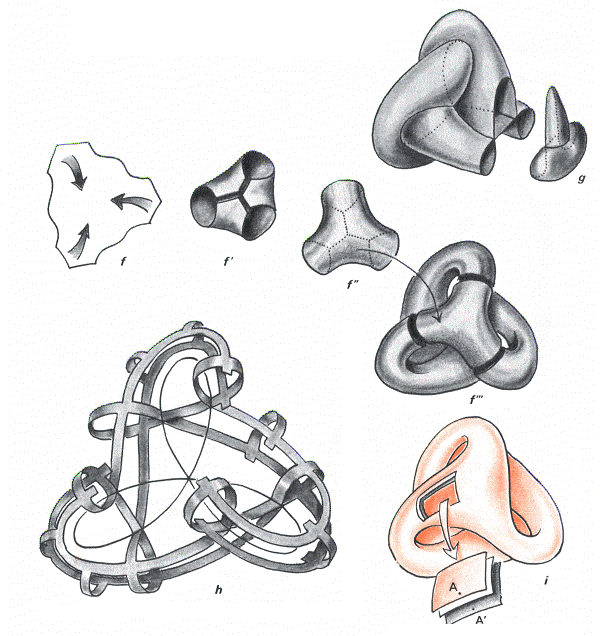 Tout est bon pour tenter d'illustrer la structure d'une surface : des bandelettes, un montage avec des pièces rapportées. On voit qu'un sculpteur trouverait son bonheur avec cet objet réellement fascinant. Un mot au passage sur son histoire. En 1901 un étudiant du grand mathématicien allemand Hilbert, Werner Boy, évoqua devant lui une surface dont personne n'avait eu l'idée auparavant. Les vacances étaient toutes proches. Hilbert dit à son étudiant :