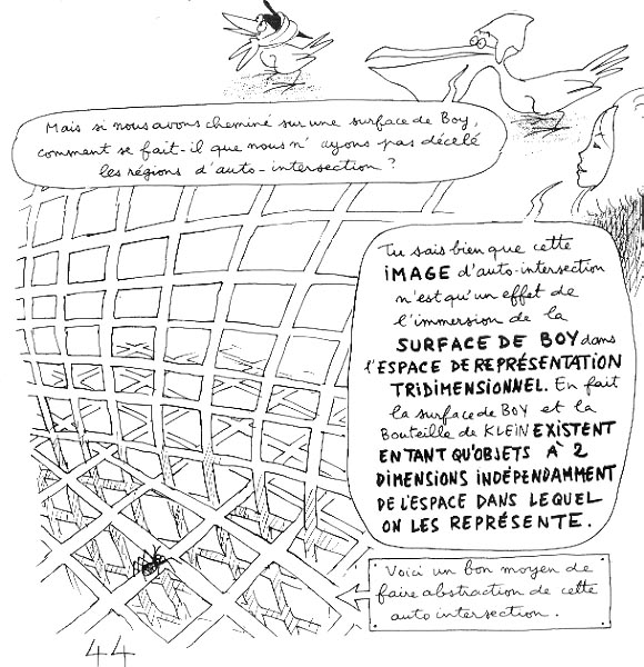Ces objets, pour peu qu'on ait quelque sens des formes, sont assez beaux. J'en ai fait construire un certain nombre quand j'étais professeur de sculpture à l'Ecole des Beaux-Arts d'Aix en Provence Mais avant que je ne passe à cette technique il y eut bien des tâtonnements où nous mélangions le fil de fer mou et le carton, ce qui donnait des résultats d'une esthétique tout à fait discutable. Je me rappelle qu'un jour j'avais du prendre le train à Marseille pour amener à Paris à mon regretté ami le mathématicien André Lichnérowicz plusieurs surfaces dont j'avais réussi à construire des représentations sufisamment parlantes. Il y avait en particulier la surface de Boy où j'avais plaqué une cartographie centré sur un pôle unique. Cela a donné à la fin un objet absolument superbe, qui fut exposé pendant vingt ans dans la salle pi du Palais de la Découverte de Paris. Mais il y a un an la direction du Musée estima que cette surface était passée de mode et elle repose maintenant dans un grenier ou dans une cave. J'espère qu'elle n'a pas été écrasée dans le transport. Tout cela pour dire que vous ne pourrez maintenant voir de surface de Boy nulle part, sinon dans des livres, ou dans un CD ROM sur lequel j'ai consigné mes 18 bandes dessinées scientifiques en format pdf, dont le Topologicon. Comment se procurer ce CD-rom.