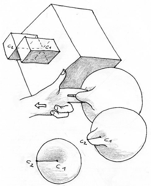 Dans la figure en bas et à droite on s'est arrangé pour loger les deux points cuspidaux C1 et C2 situés à l'extrêmité de sa ligne d'auto-intersection dans ce qu'on peut considérer comme une portion de sphère. Nous savons que nous pouvons retourner une sphère. Donc nous pouvons faire subir à cet objet le même traitement, sans nous préoccuper des différentes étapes de cette transformation. En polyédrique cela consistera à retourner le cube.