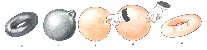 Bien que cela se voie assez mal sur ce dessin on a fait figurer en a un des cercles générateurs du tore, ceux-ci constituant une des deux familles de cercles permettant de le cartographier sans créer de singularité de maillage ( voir le Topologicon ). Lorsque l'anse a été concentrée dans une région d'une sphère ansée b la courbe est toujours visible. Quand la sphère ansée a été retournée, en c, et que l'opérateur glisse son doigt dans le passage, cette courbe entoure son doigt. Quand il "extrait" l'anse, en d, on voit ( image finale e, celle du tore retourné ) que ce cercle est devenu le .. cercle de gorge de la surface. Ainsi, quand on part d'un tore cartographié à l'aide d'un double réseau de cercles méridiens et de cercles parallèles ( le cercle de gorge appartenant à cette seconde famille ) on voit que l'opération de retournement échange ces deux familles. Cela a quelque chose de magique et j'avoue que cela dépasse mon entendement personnel. Chacun doit apprendre à connaître ses limites. Je pense personnellement qu'il il y a certaines démarches mentales où le cerveau devrait être équipé d'un fusible.