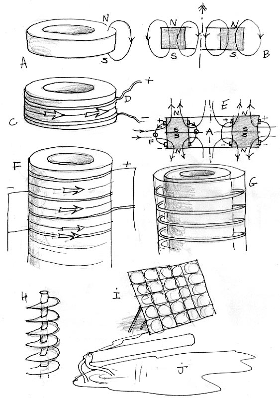 C'est un montage, mais vous pourrez en imaginer dix différents dans l'heure qui suit. J'ai pris celui-là parce qu'il s'agit d'un système que nous avions effectivement testés ( figure C ) en 1976, dans les caves de l'observatoire de Marseille où Viton et moi avions installé un labo "où l'avenir appartenait déjà au passé", en paraphrasant les célèbres "muppets" anglais. On trouvait à l'époque des aimants développant 900 Gauss (0,09 tesla), de forme torique, à section carrée. Le sens du champ est indiqué. On ajoute à cela le principe de l'accélérateur pariétal dont l'avantage est de pouvoir réduire autant qu'on le souhaite la distance entre deux électrodes, ce qui est appréciable quand on travaille sur un fluide à très faible conductivité électrique (l'eau douce). Mais avant d'envisager les choses sous cet angle vous pouvez prendre deux solides aimants (les nôtres avaient un diamètre hors tout de 8 cm et une section carrée de 15 mm par 15 mm). Vous les collez "nez à nez" avec de la superglue, en mettant deux faces nord, ou sud, peu importe, en regard. Pour les électrodes nous avions simplement fixé à la pince deux fils de cuivre rouge de 2 mm de diamètre. Mettez le tout dans une bassine emplie d'eau saturée de sel et connectez les fils à une batterie. Vous obtenez une très jolie centrifugeuse.
