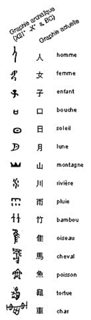 On reconnaît aux pictogrammes de cette sorte une grande ancienneté en Chine. On en trouve sur des poteries néolithiques, où ils correspondent souvent, vraisemblablement, à des noms de clans. Mais il faut attendre plus longtemps, jusqu’au XIVe siècle avant notre ère, pour qu’ils concourent à former une écriture à strictement parler, c’est-à-dire un ensemble de signes agencés, organisés selon une syntaxe, propre à véhiculer un discours, et réexploitables dans des énoncés multiples.