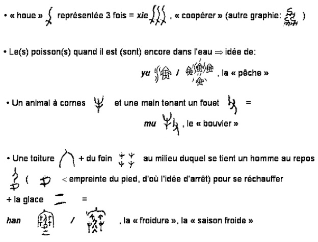 L’une des caractéristiques du pictogramme, tels ceux représentés ci-contre (Ill. 1), est que, du signe au sens, il n’y a aucun truchement de la langue qui est parlée. Un peu comme les panneaux de signalisation, les « objets » représentés dans cette liste peuvent être lus dans n’importe quelle langue, dès lors qu’il s’agit simplement d’associer un mot de la langue au « dessin » de la chose qui correspond à ce mot : on pourrait les « lire » homme, femme, enfant, bouche, soleil, etc., aussi bien qu’on pourrait les « lire » dans leur version chinoise : ren, nü, zi, kou, ri, etc. Il n’y a qu’un rapport d’association entre le mot et le signe écrit : il s’agit moins là d’une lecture que de ce qu’on pourrait appeler une « paralecture ». Tous ces caractères subsistent encore aujourd’hui, ayant évolué historiquement dans la forme, mais étant restés inchangés quant au sens.