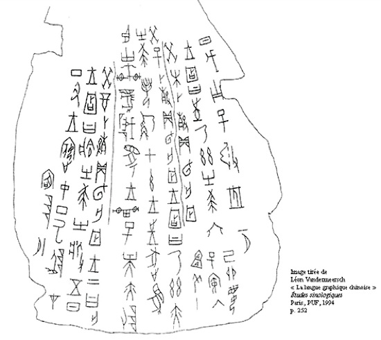 En Chine, les choses en allèrent bien autrement, et c’est là qu’il faut nous reporter aux origines de l’écriture. Car c’est certainement du côté de ce qui a été investi, et ceci très tôt dans cette civilisation, dans ce qui est de l’ordre du tracé, qu’il faut reconnaître des traits distinctifs suffisamment perdurant pour avoir porté leur ombre sur l’ensemble de l’histoire de l’écriture dans cet univers culturel.