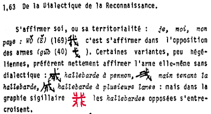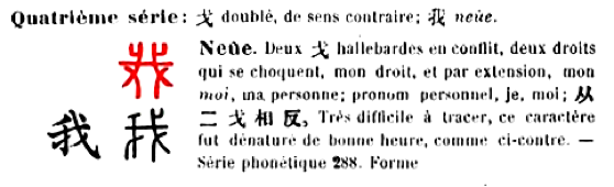 Tout à fait récemment grâce à l’obligeance de Guy Flecher qui m’a fait parvenir le tome I du livre de Ryjik « L’Idiot chinois » (Voir sa définition de « idiotes grec », celui qui na pas d’image en miroir, à mettre en relation avec cette assertion de J. Lacan : « La masturbation est la jouissance de l’idiot »). Je suis tombé sur ce passage concernant ce « 我 ». L’on voit que l’auteur critique ceux qui affirment l’arme elle-même sans dialectique et reprend le même caractère spéculaire que le P. Wieger, dans la graphie dite « sigillaire ». Image 2 et 3.