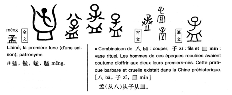 L’analyse du caractère qui écrit le nom de Mencius, n’est pas sans poser de question sur la détermination d’un destin (fondateur de ce que l’on pourrait nommer à l’occidental : philosophie politique, l’éthique plutôt que la morale) par une nomination. Mengzi en effet est le seul à soutenir que l’homme est naturellement bon, et son oeuvre qui date des royaumes combattants n’a pas été détruite par le premier Empereur.