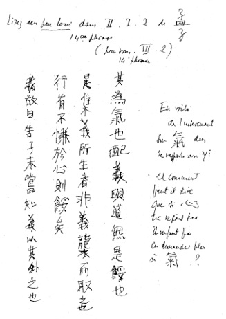 Cette conférence a été publiée dans un recueil : Lacan, l’écrit, l’image, Champs, Editions Flammarion, 2000, isbn 2-08-081454-0. Dans cette publication, François Cheng nous donne à voir la copie faite par Lacan d’un extrait du Mencius (chap.II), tel qu’il apparaît ci-contre.