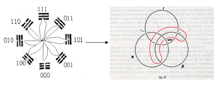 Enfin, pour un espace compacté par le signifiant du phallus, le plus ou moins de la dimension ne signifie pas un changement de structure, mais une différence dans le domaine de la représentation selon le moment du sujet inscrit dans la coupure. C’est-à-dire : quelle que soit la dimension que nous détachions d’un espace compact dans l’imagination, il reste la même structure. Les huit trigrammes, d’une façon nouvelle, nous aident à comprendre l’équivalence entre les différentes approches psychanalytiques de Lacan en topologie : soit la bande de Mœbius, le cross-cap et le nœud borroméen.