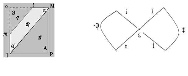 Dans le schéma R, « Mimi » ne signifie pas quatre objets, mais les repères locaux de la fonction de l’objet. C’est-à-dire, à un moment donné, à partir d’un objet fantasmatique, on arrive à construire quelques appareils pour designer la multidimensionnalité de l’objet [35]. Il n’existe essentiellement qu’un seul espace [36]. Les deux espaces opposés au niveau de la figure n’indiquent que les dimensions intrinsèques. Freud l’appelle « l’ambivalence de l’objet ». Lacan trouve aussi que le sujet a toujours deux possibilités d’aliénation par un objet fantasmatique.