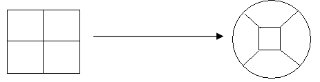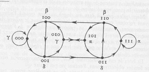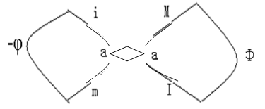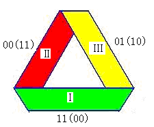 Si l’on repère chacune des surfaces de la bande de Mœbius par le numéro selon qu’elle soit en dessus ou au dessous, par rapport à d’autres surfaces voisines, la surface I est définie comme 11, sa surface inverse est donc 00. Maintenant, si l’on dessine une ligne à partir de n’importe quelle surface, soit une coupure, on obtient la suite : 11→10→00→00→01→11. Par rapport à une autre représentation plane de la structure mœbienne (figure 15), on trouve que la surface Ⅲ (01-10) fonde la partie passagère dont l’essentiel est illusoire.