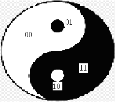 De la même façon, on peut repérer la figure des deux poissons selon la figure 19. Il s’avère que « le noir dans le blanc » ou 01, avec « le blanc dans le noir » ou 10, construit une partie passagère. Instinctivement, la figure des deux poissons reflète l’échangeable entre le noir et le blanc.