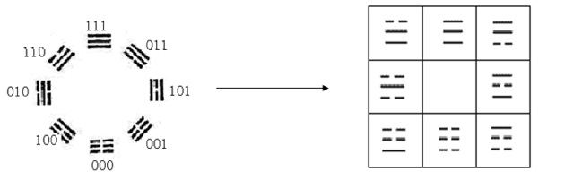 En ce qui concerne le Yijing, il existe deux écoles qui divergent selon qu’elles mettent l’accent sur la forme (象数 XiangShu) ou sur le contenu (义理 YiLi). L’expression de XiangShu, qui signifie littéralement l’algèbre de l’image ou de la représentation, indique aussi l’ambiguïté entre algèbre et géométrie [24]. En réalité, on s’aperçoit que les huit trigrammes sont une formation spatiale combinée avec des repères discrets, ou une suite discontinue, mais sous forme spatiale.