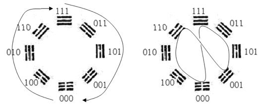 Effectivement, si l’on considère les huit trigrammes comme une paire binaire, on voit que ceux-ci représentent deux processus : le premier, 111→011→101→001→000, le deuxième, 000→100→010→110→111. À savoir deux processus complémentaires, l’un diminuant progressivement et l’autre augmentant progressivement (figure 8).