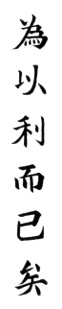 Also handelt es sich um ku und ebenso um i wei. Ich sagte bereits, dass dieses wei in bestimmten Fällen ›handeln‹ [agir] bedeutet, das heißt, etwas aus der Ordnung von ›machen‹, wenngleich es nicht irgendeins ist. Das Schriftzeichen i hat hier die Bedeutung [sens] von etwas wie ›mit‹ [avec]. Wir werden dieses ›mit‹ als was?, als li vornehmen [procéder], denn es geht um das hier von mir fokussierte Wort. Dieses li, das so viel bedeutet wie Gewinn [gain], Nutzen [intérêt], Erlös [profit], und die Sache ist um so bemerkenswerter, wenn wir uns auf das erste Kapitel beziehen.