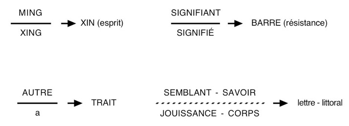 Arrêtons-nous un moment. En effet il me semble nécessaire de repréciser, les étapes de l’introduction par Lacan des termes xing, ming, et xin. Il faudrait en reprendre le cheminement pas à pas, en essayant d’en suivre les méandres, les allers et retours, et revirements, les hésitations, les forçages. Lacan ici ne trouve plus comme il avait l’habitude de le dire en citant Picasso, il cherche, il tourne en rond comme il dira au détour d'une phrase. Je me contenterai ici d’en poser les jalons. Un petit guide de lecture en somme à mon usage et au vôtre si vous le voulez. Je soulignerai de gras les passages qui me paraissent les plus significatifs et ne relèverai que quelques traits parmi les plus saillants à mes yeux.