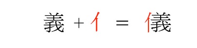 On peut revoir les deux caractères chinois : 儀 yí et 義 yì. Qu’est-ce qui les distingue ? Sur le plan de la signification, il y a quelques distinctions que nous avons déjà discuté, mais qu’ils ne sont pas très absolues. Sur le plan de la prononciation, c’est le même [yi]. Mais, il y a une différence d’écriture de part la clé « 亻 » qui est le corps (Fig. 4). Cette clé, le corps, est ce qui différencie 儀 yí et 義 yì.