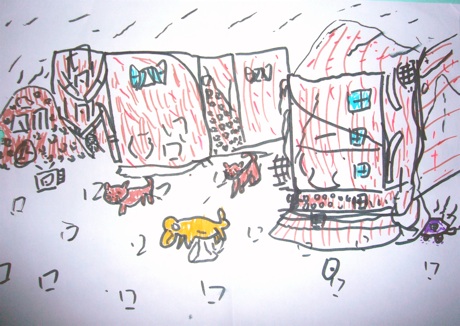 Elle n’aima pas causer. Si je demandai quelques questions, elle les répondit avec quelque mots. Je lui proposai de faire dessin. Elle fit d’accord. Les dessins sont sur la catastrophe : les ruines de construction, les meubles partout, les gens par terre (peut-être morts), les gens courants et cherchant…