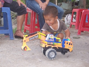 Et puis, sa famille trouva une chose très surprise : ce garçon joua avec ce jouet tout le jour, petit à petit, sa santé devint un peu mieux qu’avant. Sa famille connut que ce fit une bonne chose pour ce garçon. Quand il abîma le jouet-pelleteuse, sa famille acheta un autre pour lui… Dans un mois et demi, il abîma quatre jouet-pelleteuse ! Quand j’ai rencontré le garçon, il a déjà recouvert sa santé qui est comme avant du séisme, il a encore joué son jouet-pelleteuse, de façon un peu violente, en jouant, il a dit quelques courtes phrases, la voix est un peu haute, un peu vague aussi. [4]