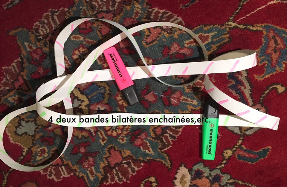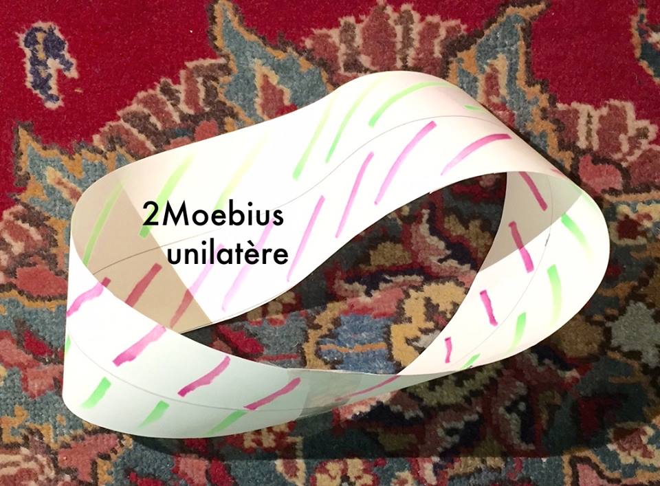 1 ) Soit une bande de Moebius, en la coupant par le milieu, au terme de son premier bouclage on obtient une bande bilatère avec un envers et un endroit :