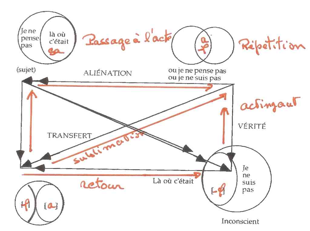 En haut à droite : on a le cogito lacanien, obtenu par transformation du cogito cartésien.