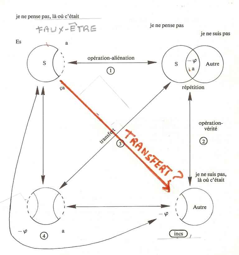 • Ce qui va apparaître au lieu du sujet supposé savoir (point 4) par l’opération du transfert, c’est la disjonction du (-phi) et de l’objet (a) produisant de ce fait la chute du sujet supposé savoir : cette soufflure de savoir frappé par le desêtre dès qu’émerge ce qui lui a donné son assise, l’être même du sujet.